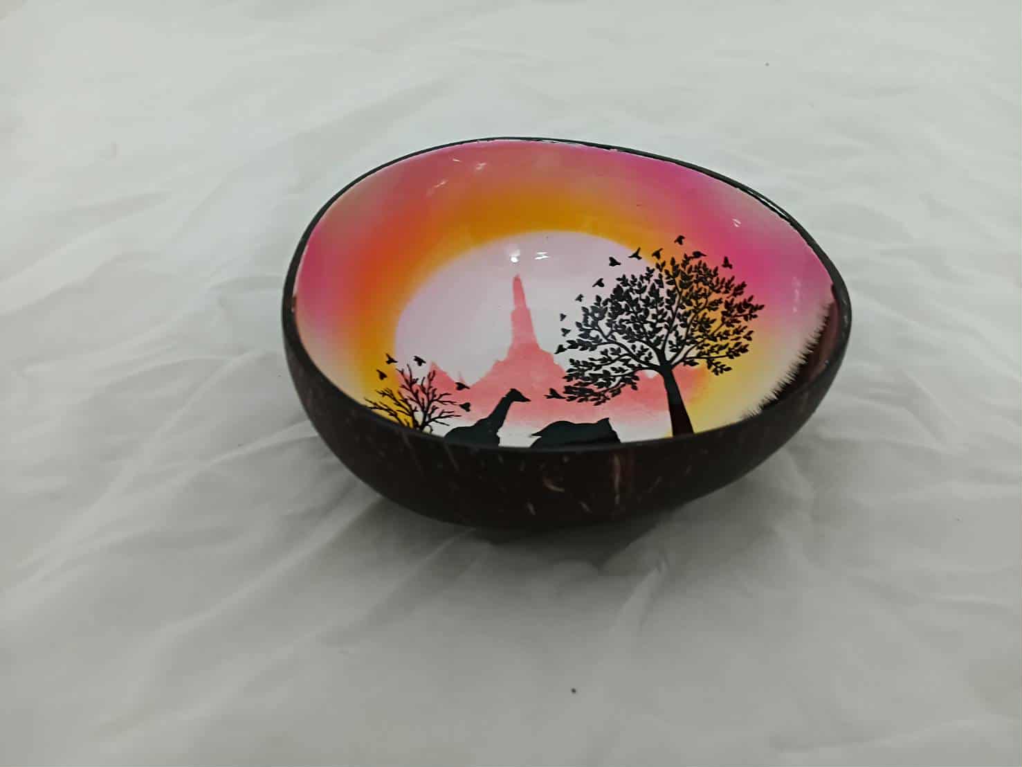 สินค้าชิ้นนี้ถูกสร้างสรรค์จาก กะลามะพร้าว แท้ที่ผ่านการขัดและทำความสะอาดอย่างพิถีพิถัน เพื่อให้ได้รูปทรงที่สมบูรณ์แบบสำหรับงานศิลปะ เพ้นท์ด้วยสีคุณภาพดีโดยช่างฝีมือผู้เชี่ยวชาญ